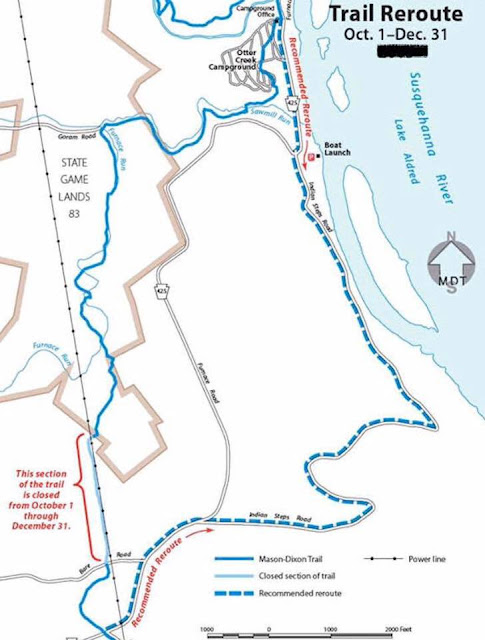 IMPORTANT NOTE: The Mason-Dixon Trail along the power line right-of-way from PA State Game Lands 83 boundary to Bare Road (Map 5) will be closed due to hunting from October 1 to January 31, annually. The recommended rerouting for that period of time is between Otter Creek Campground and Newcut Road: follow PA425 to Indian Steps Rd, follow Indian Steps Rd to PA425 and then to Newcut Rd. PLEASE HONOR THIS SEASONAL CLOSURE SO WE DO NOT LOSE ALL ACCESS TO THIS PART OF THE TRAIL.